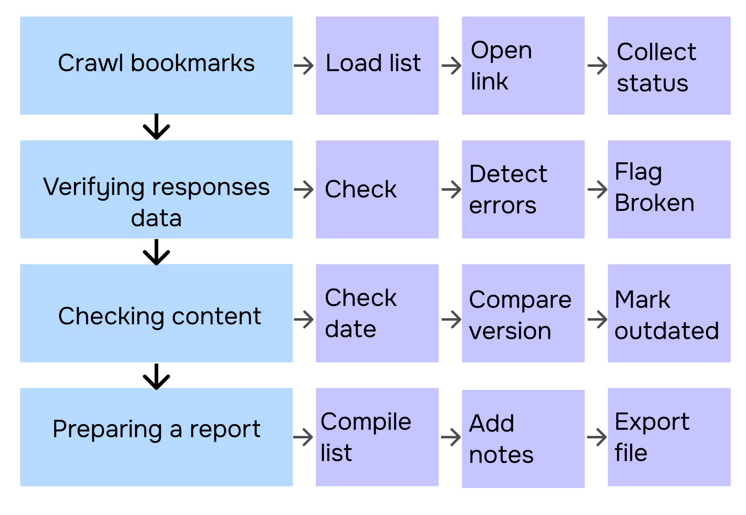 The AI agent loads your bookmark list and systematically opens each link for inspection.