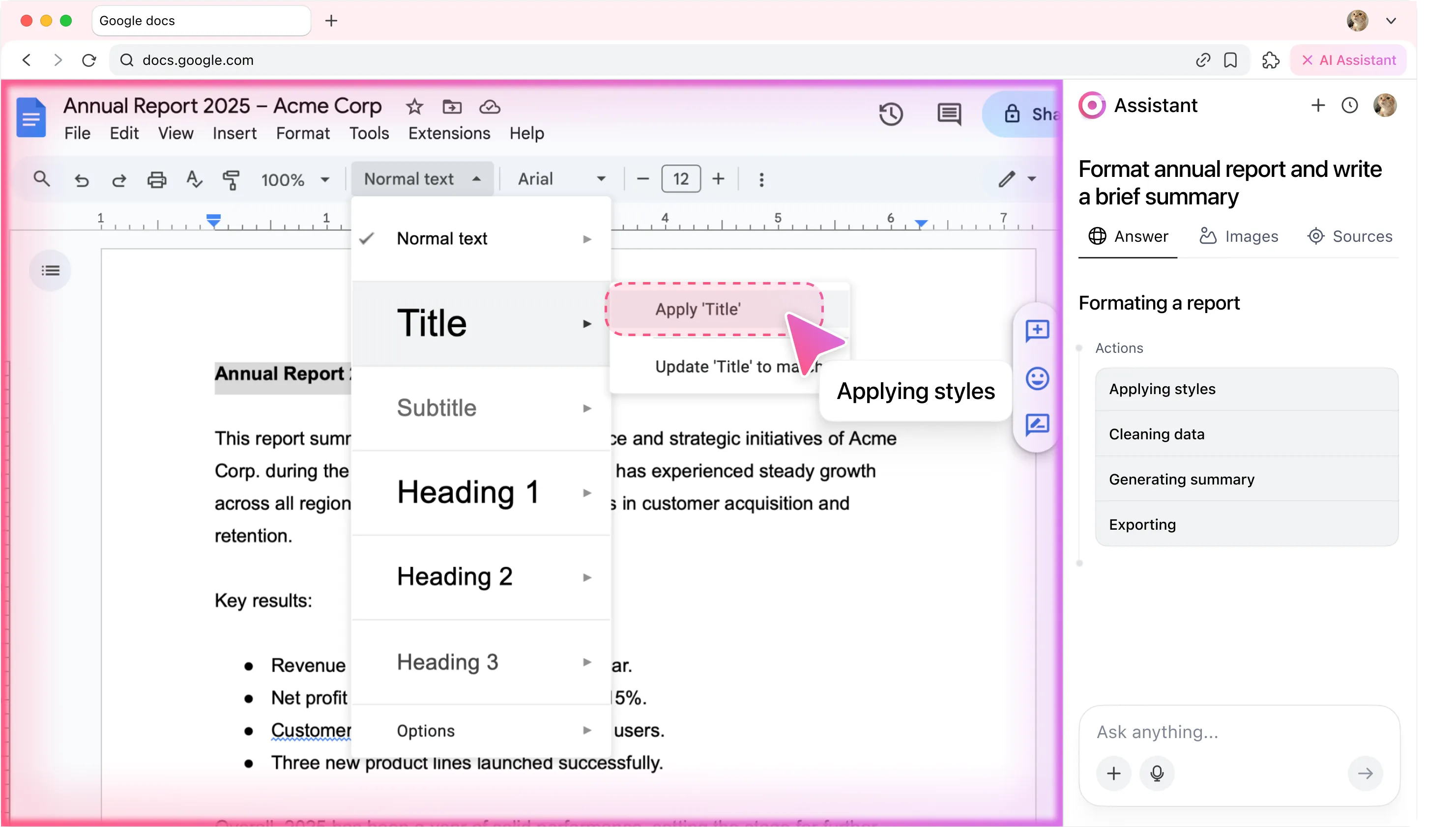 The AI agent formats your document with heading styles, tables, and a clear structure inside a private workspace on your device.