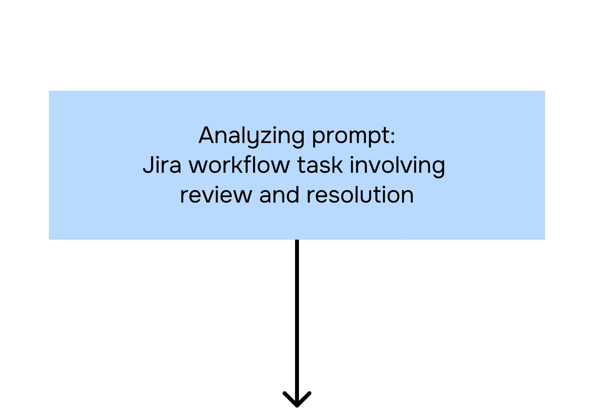 1) The agent’s categorizer first analyzes the prompt to understand the intent: it's a Jira workflow task involving review and resolution. Then, it identifies the key subtasks.