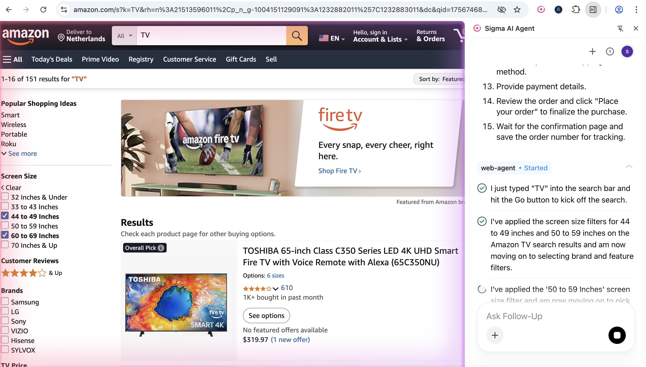 Now rewind. Same scenario, but with an AI agent inside Sigma Browser. You type: “Find me a mid-range 55-inch TV under $600 that’s good for sports and has decent audio.”